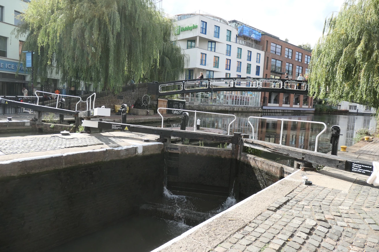 Locks at Camden raising a boat Walk along Regent's Canal to King's Cross