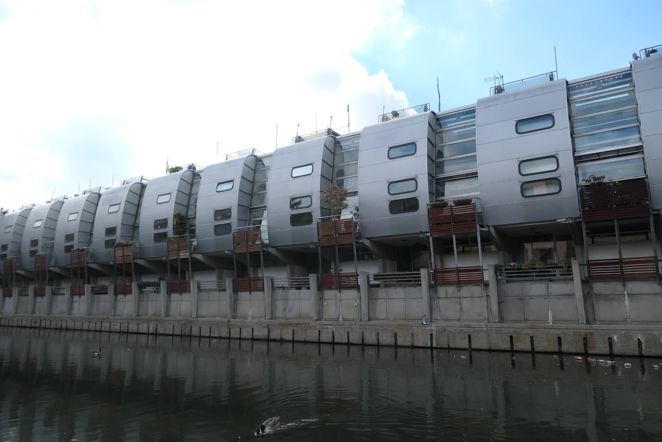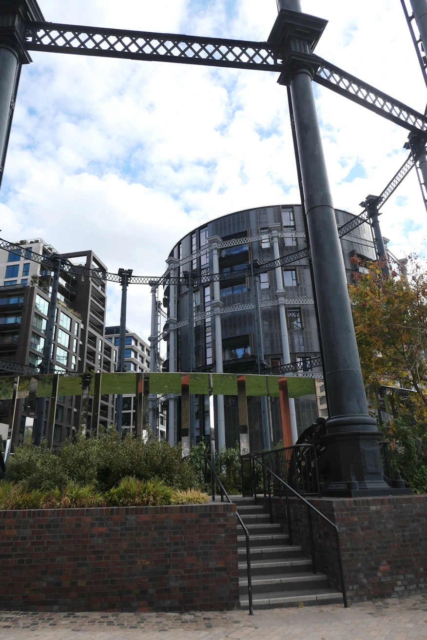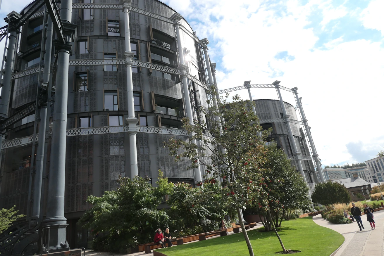 Housing development in moved Gasometers Walk along Regent's Canal to King's Cross