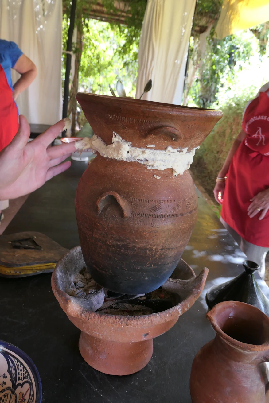 Using dough to seal the steam to cook the cuscus – Cooking class at Tahnaout