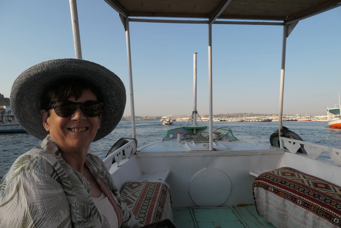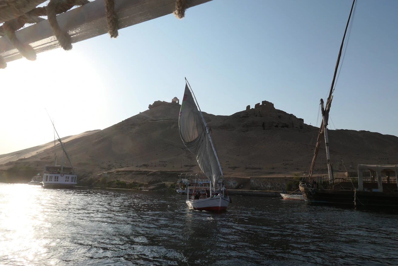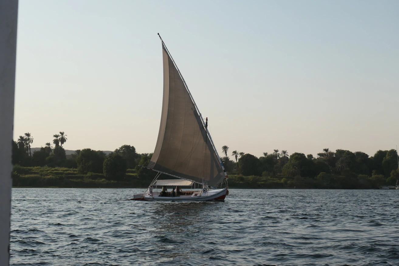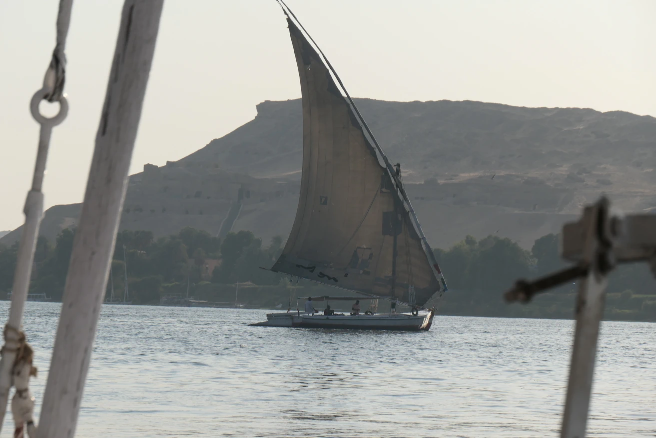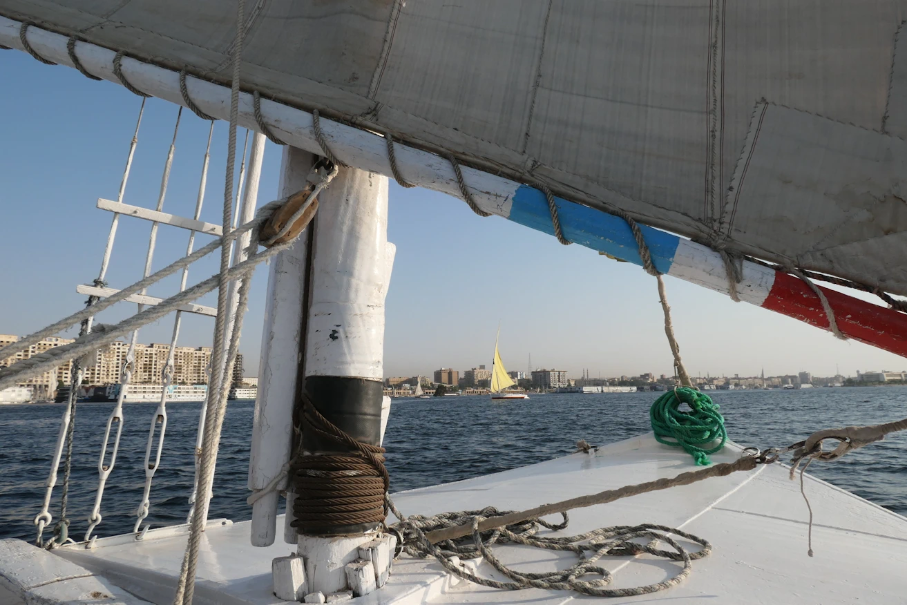 Another one passing by: note auto pilot while adjusting sails Sailing in a felucca
