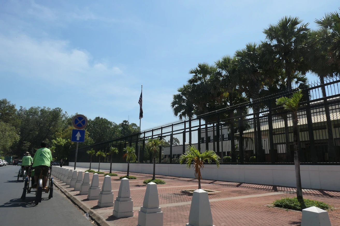 American embassy (note 5m high fence) Cyclo tour of Phnom Penh