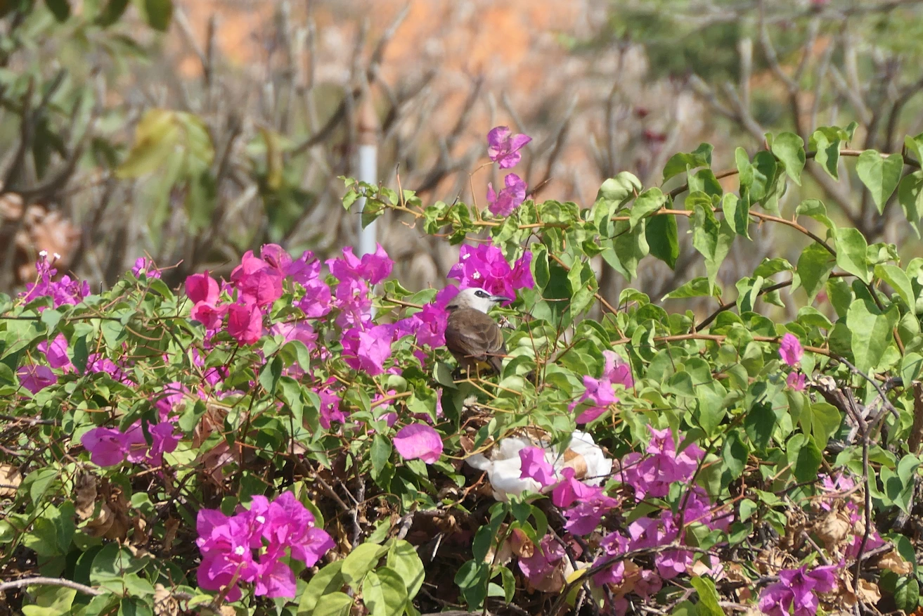 Yellow-vented bulbul in bougainvillea Oudong Monastery