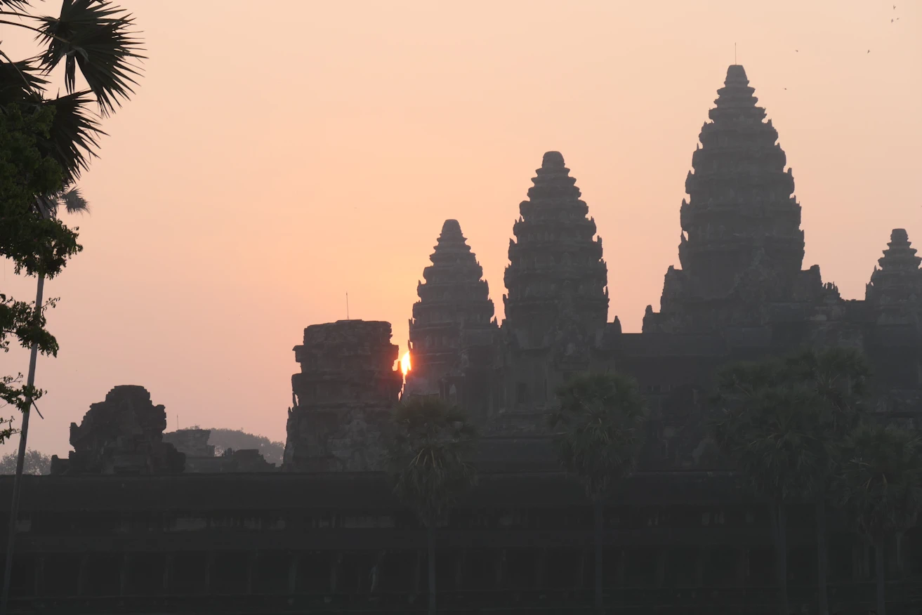The sun appearing behind main temple Angkor Wat tour