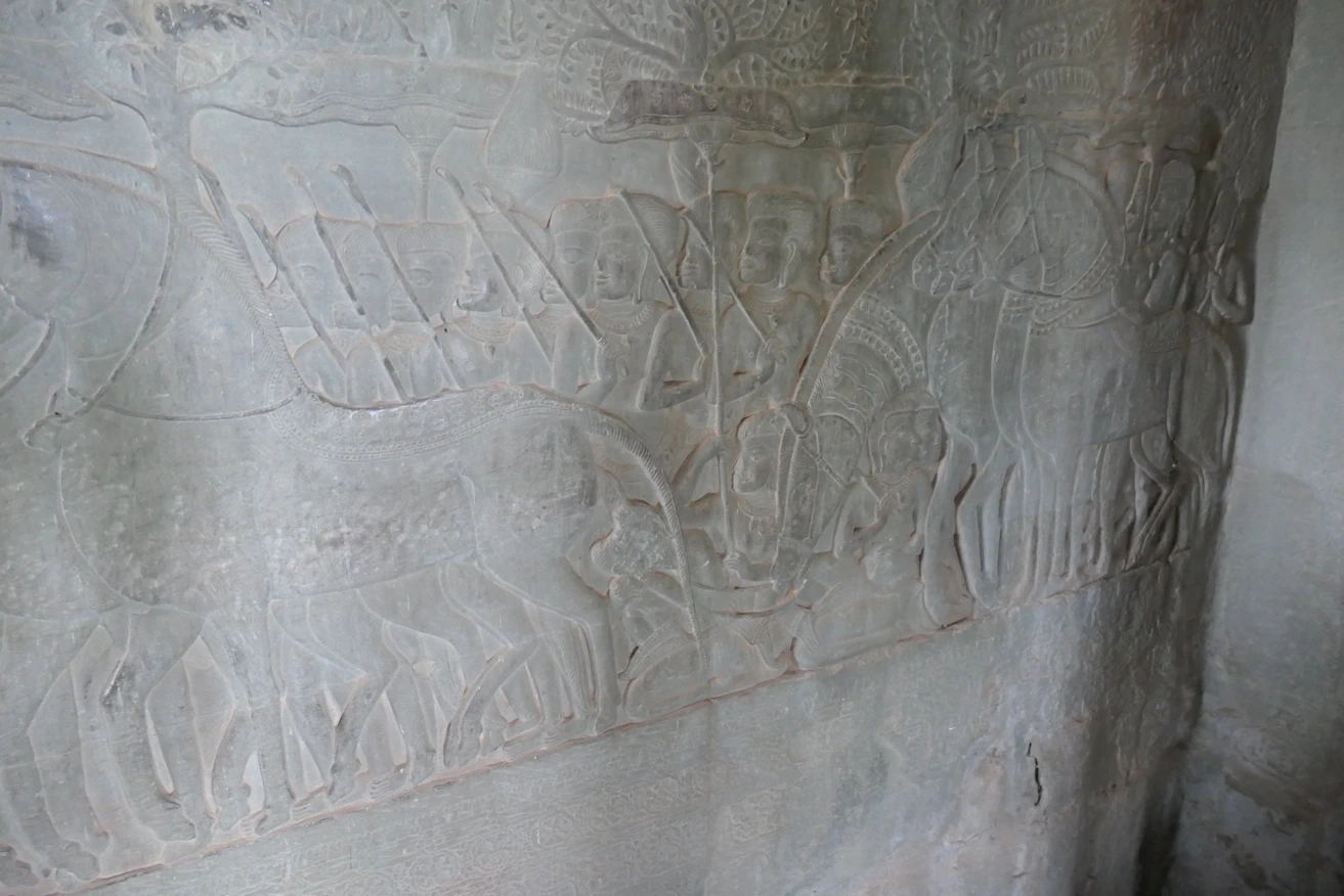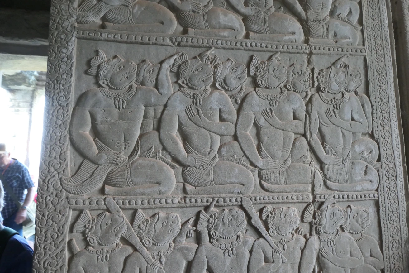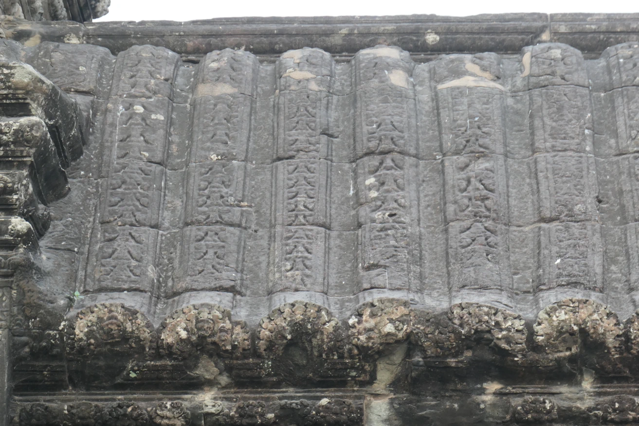 Eroded carvings on edge building Angkor Wat tour