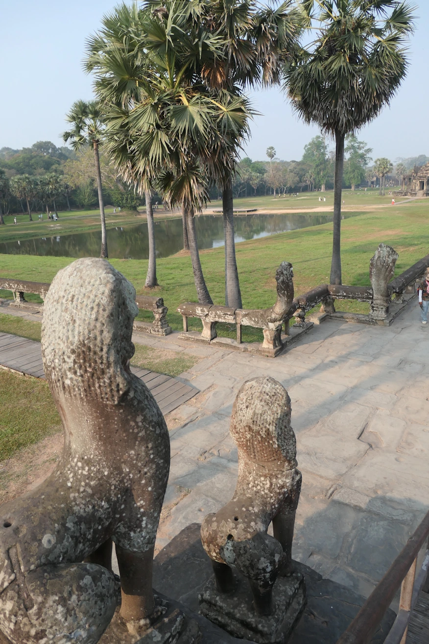 Guardian lion on moat bridge + reflection Angkor Wat tour